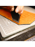С одной стороны коврик имеет серый цвет, с другой зелёный. Специально разработан для работы с французскими пробойниками и имеет нанесенные размеры от 2,7 до 3,85 мм по краям на зеленой стороне.