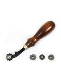 Профессиональный роликовый разметчик от японской компании LeatherCraft.jp, делающий разметку для последующего докалывания шилом и шитья. Используется при нанесении разметки по кривым линиям или на криволинейные поверхности (в основном при шитье обуви). Имеет удобную ручку и изогнутую рабочую часть, для более плотного прижатия без потерь контроля нанесения разметки.